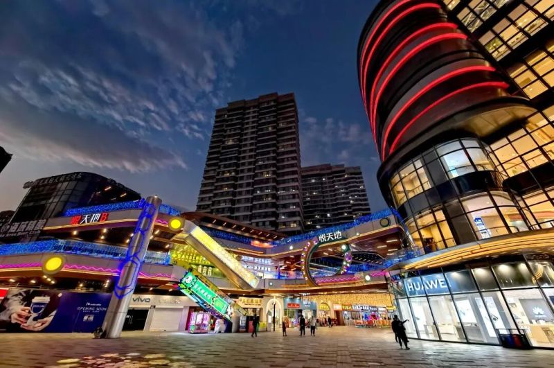 夜幕降临,这里更是变身“潮玩集合地”,烟火气与潮酷感碰撞出别样活力。港风复古的街区墙面与缤纷霓虹灯相映成趣,悦天地集市热闹开街,火爆鱿鱼、秘制烤串、酸奶麻花等特色小吃香气扑鼻,火锅、炒菜、冰饮甜品的选择让人眼花缭乱。日均1.5万人次的夜间人流量、年超700万人次的总客流量,让这里成为名副其实的“深夜食堂”和网红打卡地。
