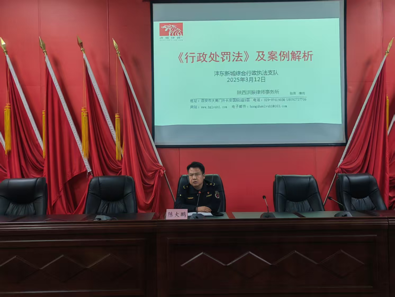 为提高行政执法人员的依法行政能力和水平,进一步规范行政执法行为,3月12日下午,沣东新城综合行政执法支队举行《行政处罚法》及案例解析专题培训会。培训邀请陕西洪振律师事务所赵由律师授课。支队各单位分管法制工作干部、法制员及一线执法办案人员共30余人参加。