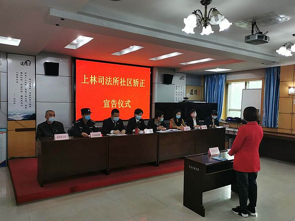 入矫宣告仪式十点准时开始。首先,主持人宣布会场纪律;其次,按照沣东新城入矫宣告流程,沣东新城司法局工作人员宣读《社区矫正宣告书》,上林司法所所长宣读社区矫正监管规定,公安民警、矫正小组成员强调矫正纪律;最后,矫正对象祁某做了表态发言。她表示在矫正期间,自愿接受社区矫正,遵纪守法,服从管理,积极改造,顺利通过缓刑考验期。