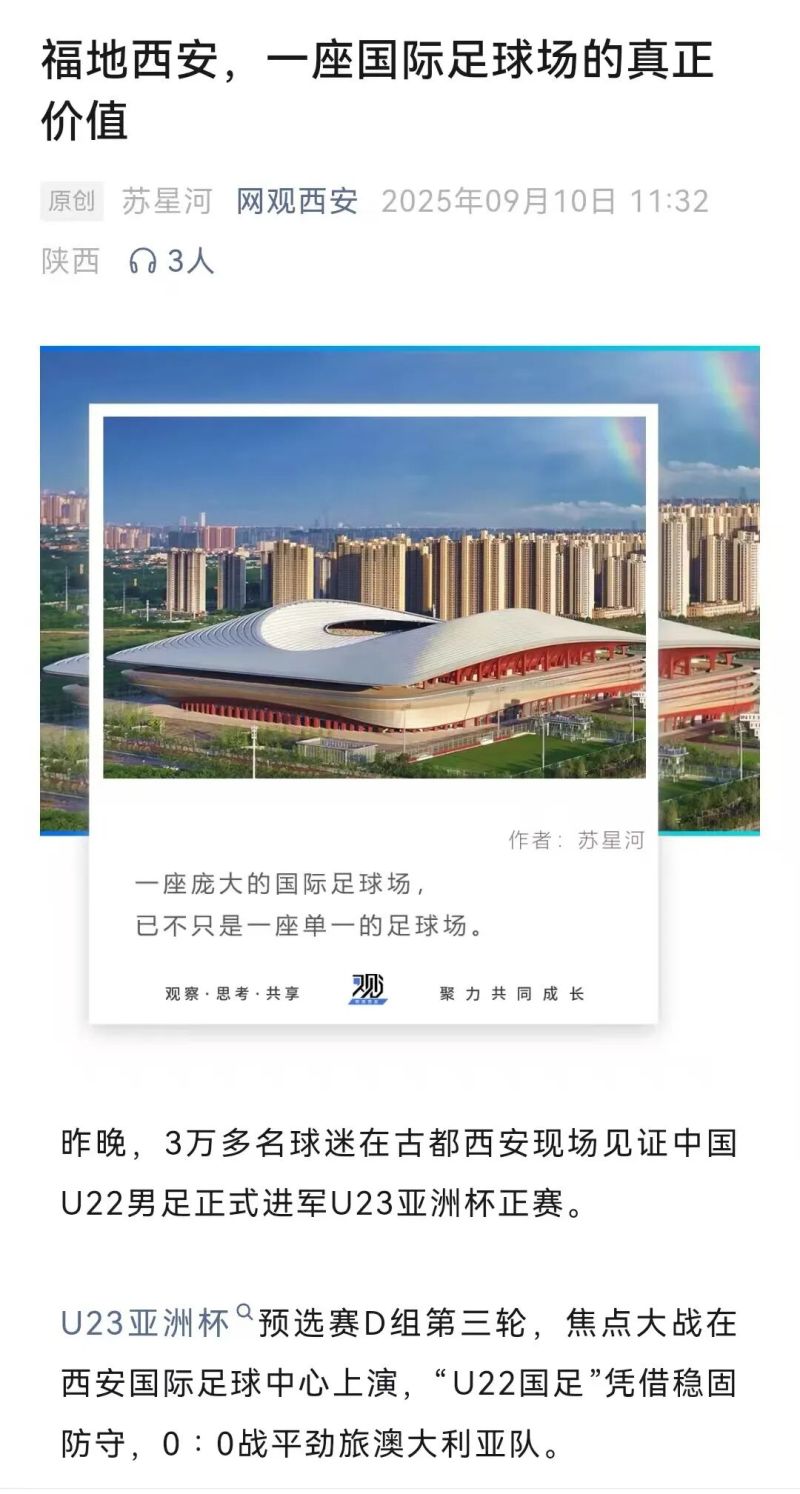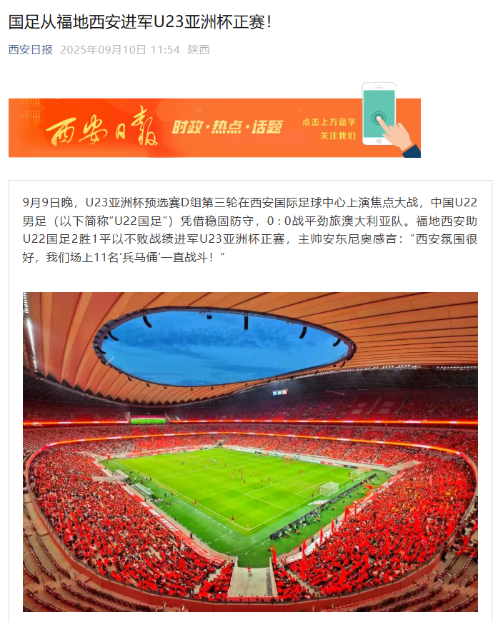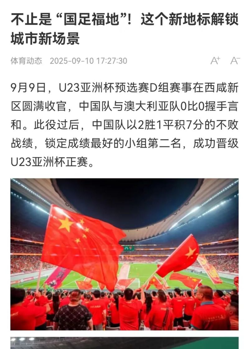福地西安国际足球中心用精细的后勤保障、全新的顶级球场和火热的白金球市助力U22国足顺利出线,为球迷带来了高水平的足球竞技盛宴,新华社、央视网体育、西安日报、西安发布等各大主流媒体及市民网友好评如潮!
