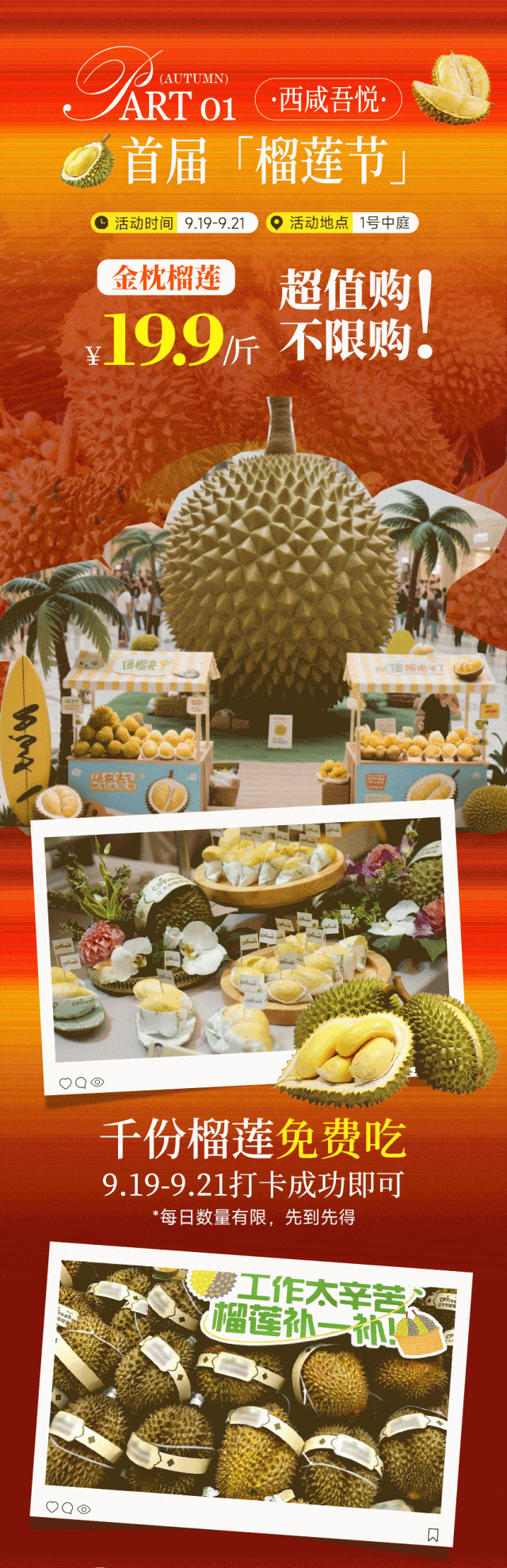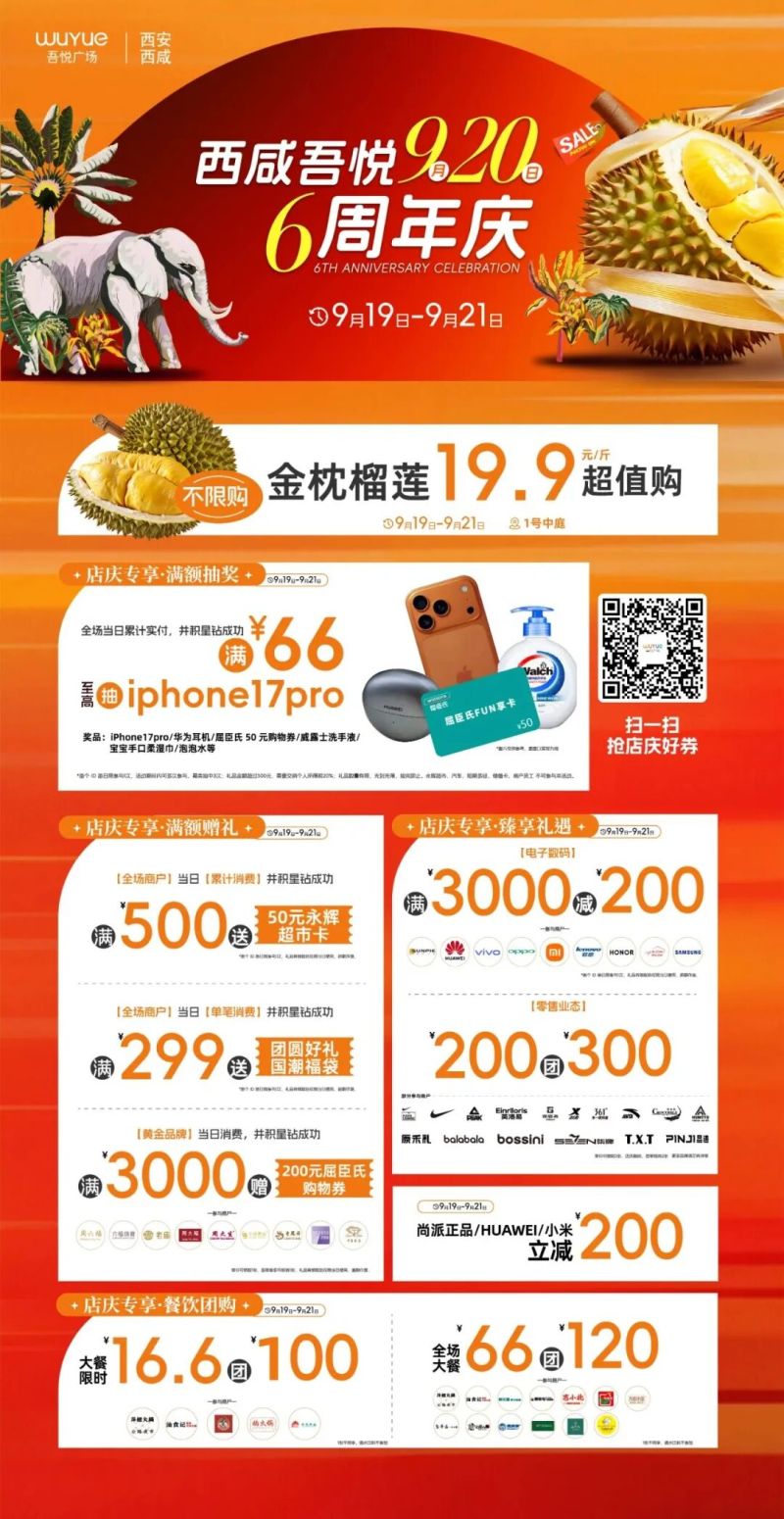 吾悦广场六周年庆火热开启。这次店庆最让人疯狂的当属榴莲福利!活动期间不限量金枕榴莲19.9元/斤抢购,自己吃或和家人分享都超划算;9.19-9.21期间,参与活动集章打卡活动即可免费试吃榴莲,先到先得。