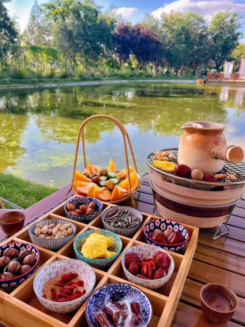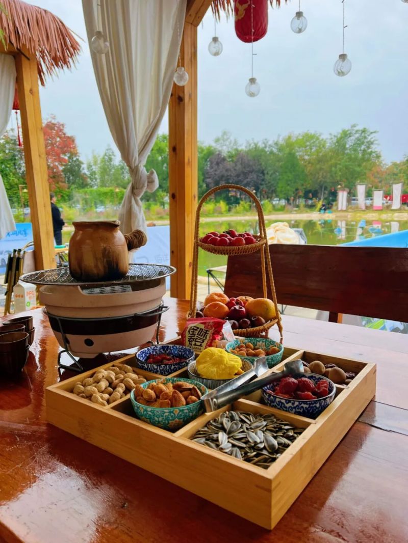 露营、钓鱼、桌游局等各类体验一应俱全。傍晚在林间火堆旁煮茶,感受时间在此静静流淌,搭配现烤的肉串以及蔬菜。同时,营地提供食材新鲜的火锅,围坐在一起分享美食,烟火味十足。