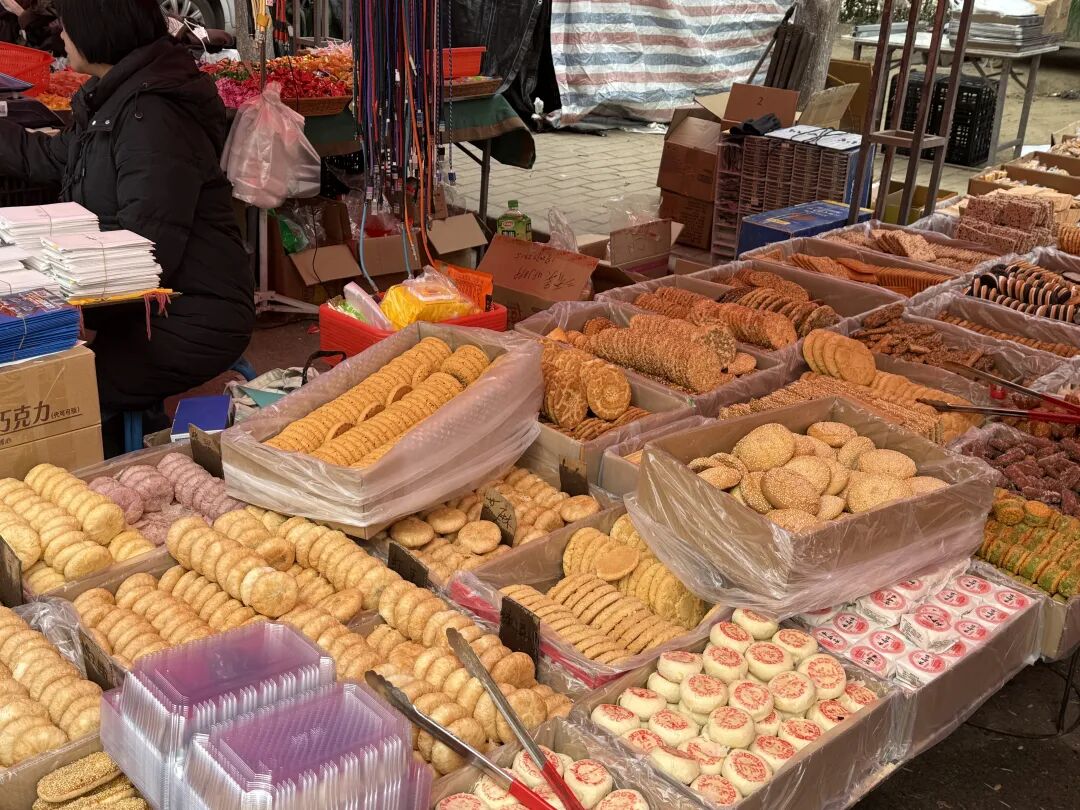 集市里的酥饼层层起酥、甜咸适口,陕西特色蓼花糖金裹银缠、甜脆绵软,各类调味香料整齐码放,八角、桂皮、花椒的浓郁辛香,为年节烹饪添上地道滋味;花生、瓜子、核桃等坚果满满当当,抓上一把,便是年节里最惬意的闲食,还有各式承载童年记忆的小零食,酸甜的果丹皮、酥脆的石头饼,一口尝回儿时年味。