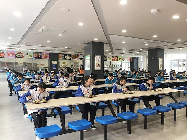 (学校食堂对用餐学生进行班级区域划分,实行单人单桌)