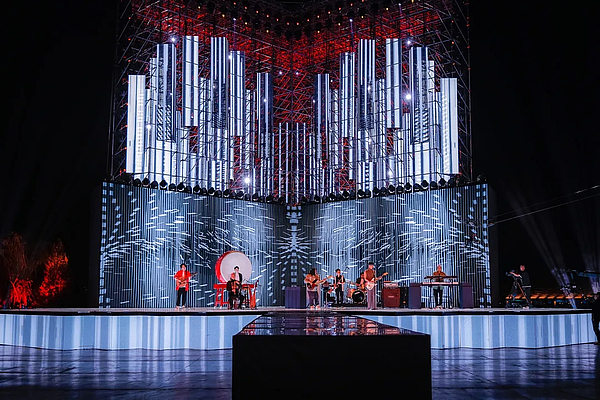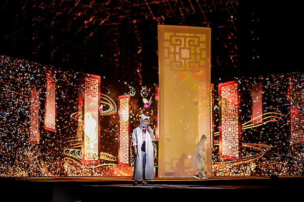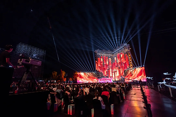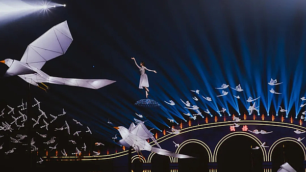 昆明池的舞台融入了现有的建筑、湖面、鹊桥等元素,灯光要在此基础上增强舞台张力,展现舞台气势,因此灯光设计在舞台后区搭建了一座二十多米高的雷亚架以展现雄伟的气势的同时来配合舞台塑造节目氛围。