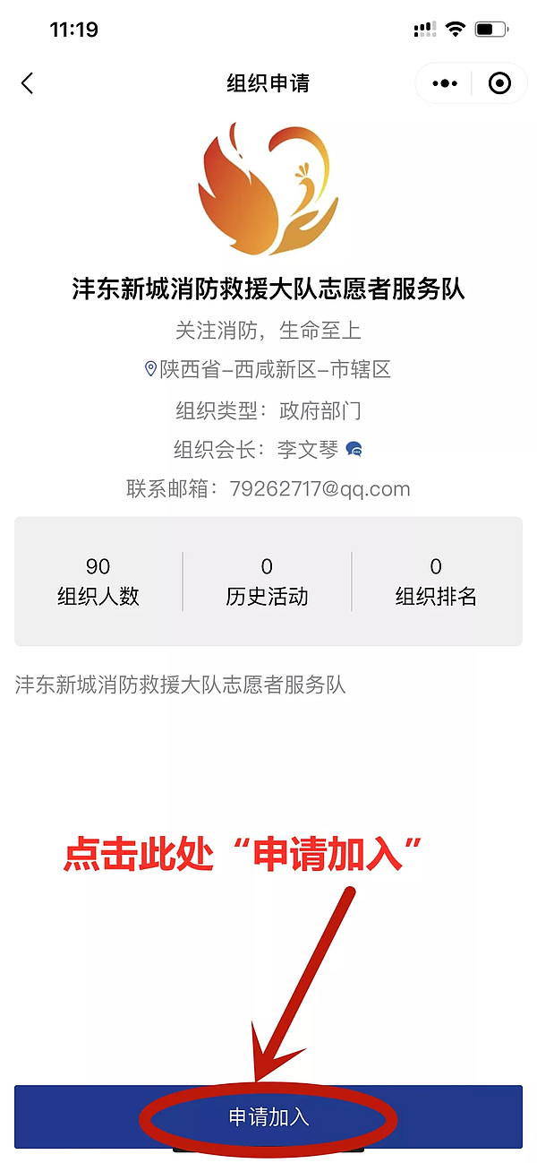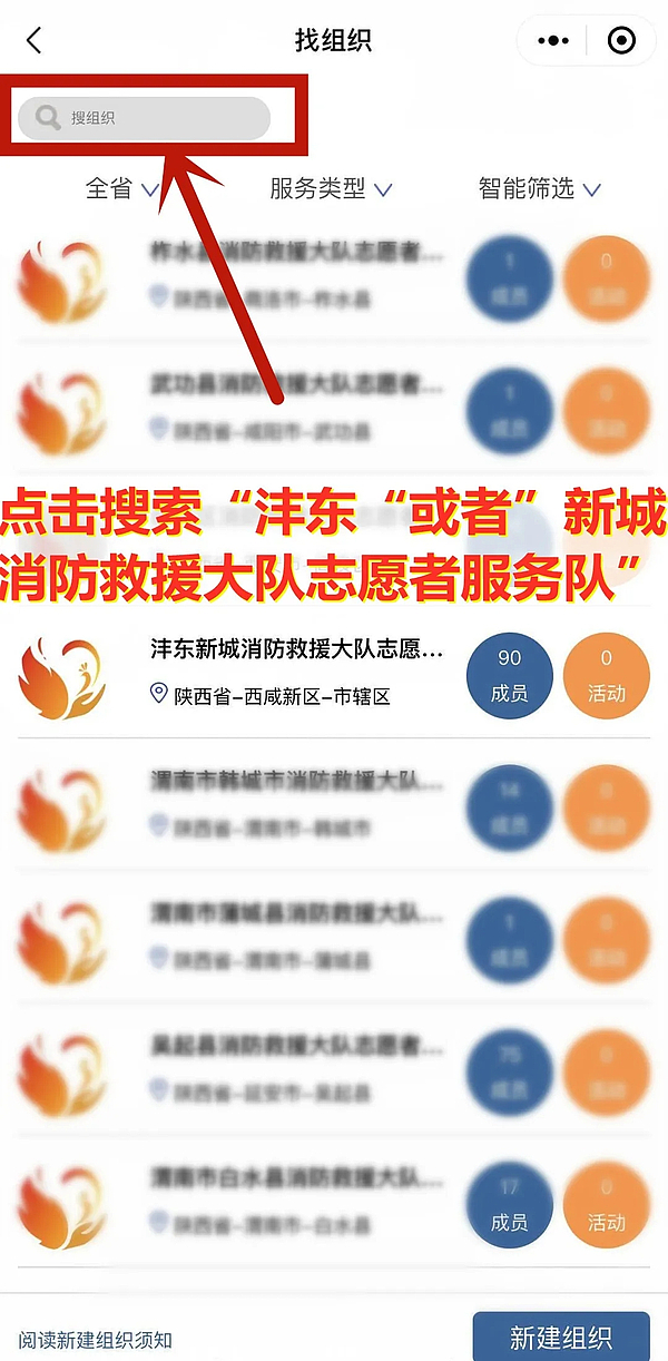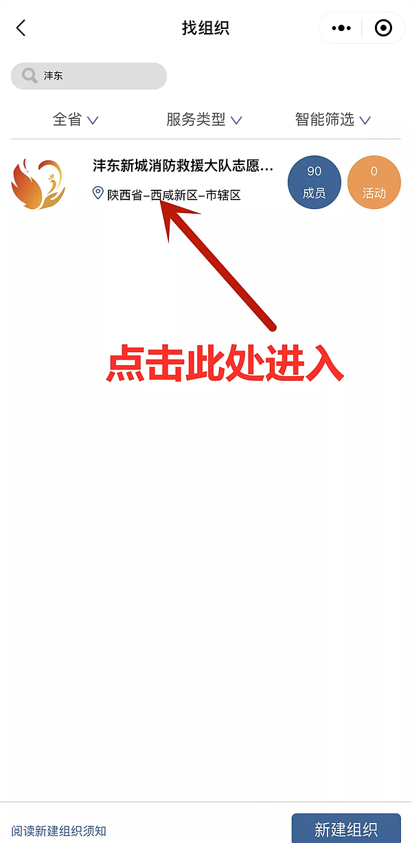 第五步:完成信息后,返回首页“找组织”搜索或查找“沣东新城消防救援大队志愿者服务队”申请加入。