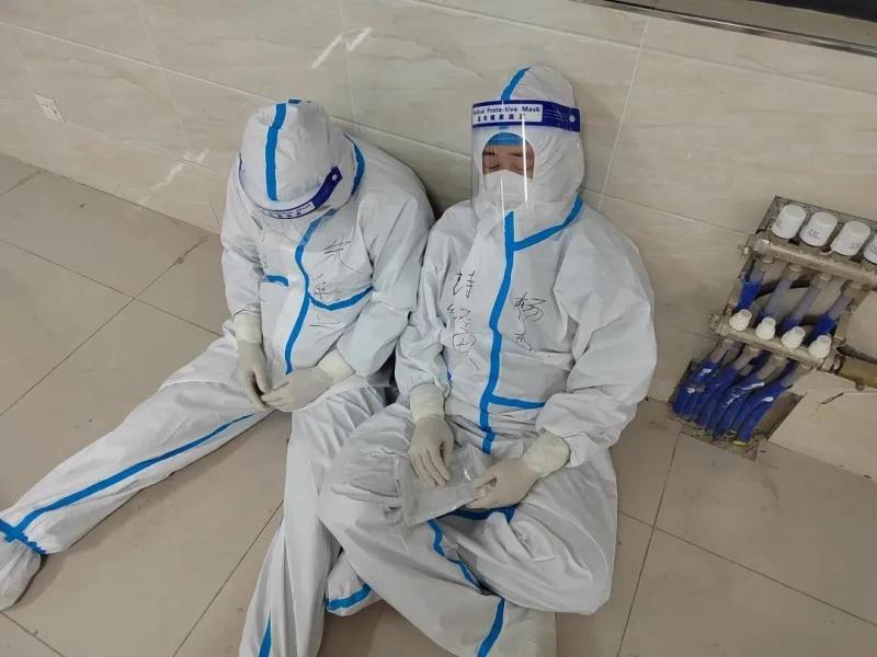 忙碌之余,在三桥街道凤凰城小区支援的工作人员席地而坐,相互依靠着休息片刻。