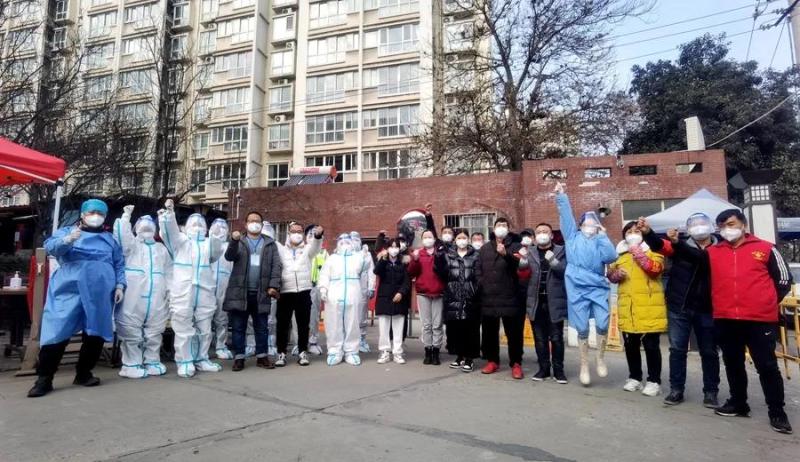 “西安加油!沣东加油!” 12月29日下午,火车站社区三泰丽园小区采样点上,完成了新一轮的核酸采样工作之后,现场的工作人员合影留念。