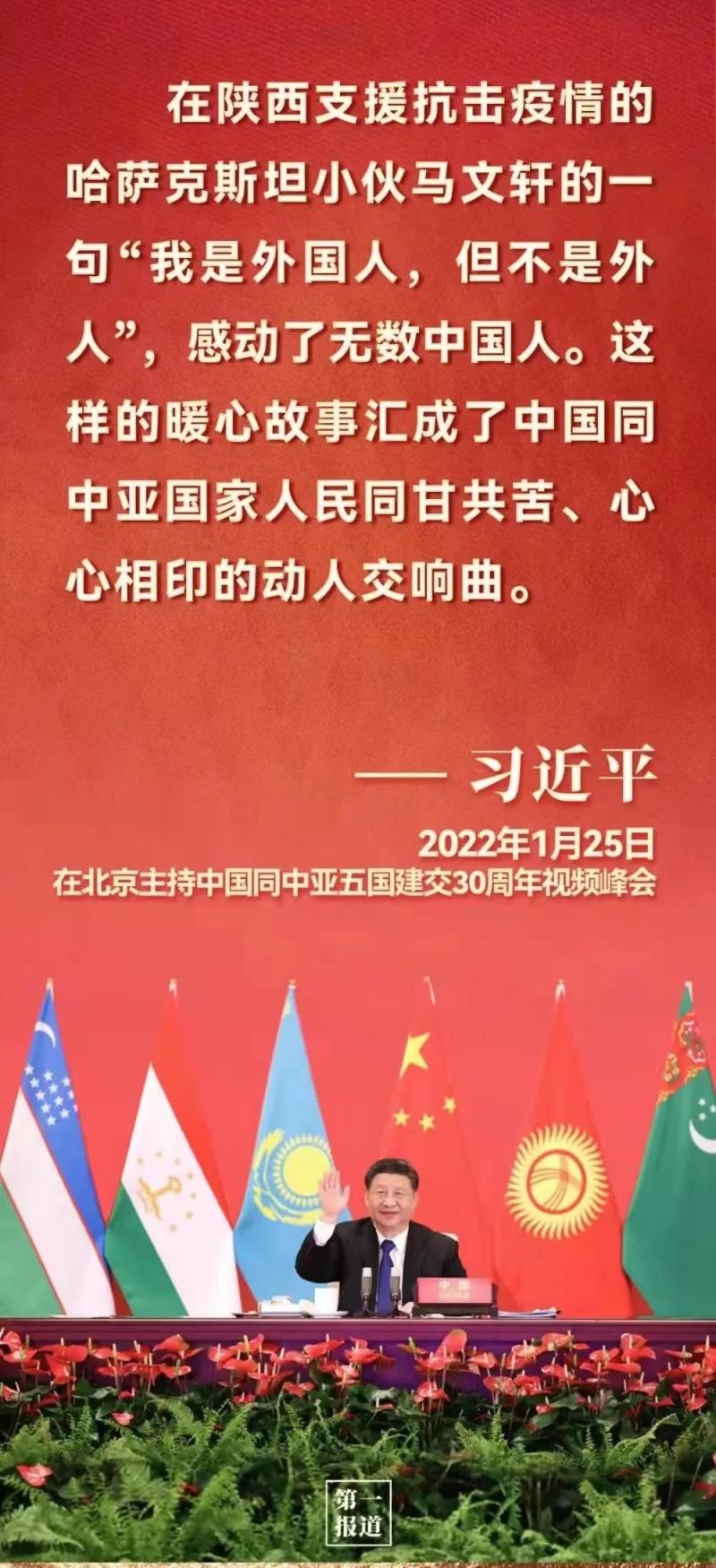 1月25日,国家主席习近平在中国同中亚五国建交30周年视频峰会上的讲话中提到,在陕西支援抗击疫情的哈萨克斯坦小伙马文轩的一句“我是外国人,但不是外人”,感动了无数中国人。这样的暖心故事汇成了中国同中亚国家人民同甘共苦、心心相印的动人交响曲。