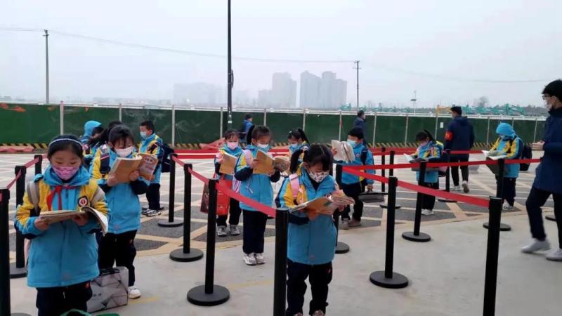 沣东第九小学的同学们在排队等候入校的间隙读书
