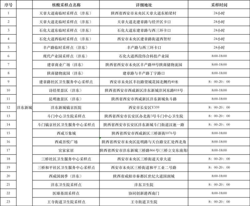 沣东新城核酸采样点位表