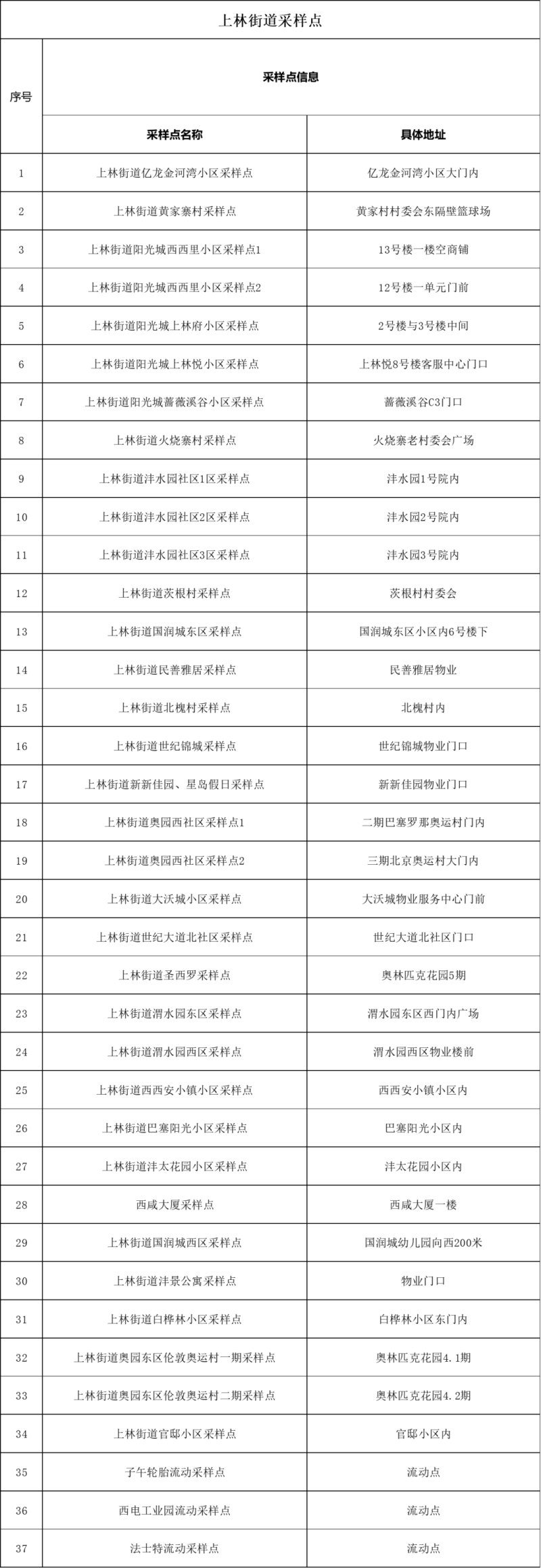 沣东新城核酸采样点位表