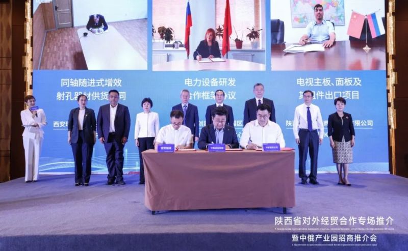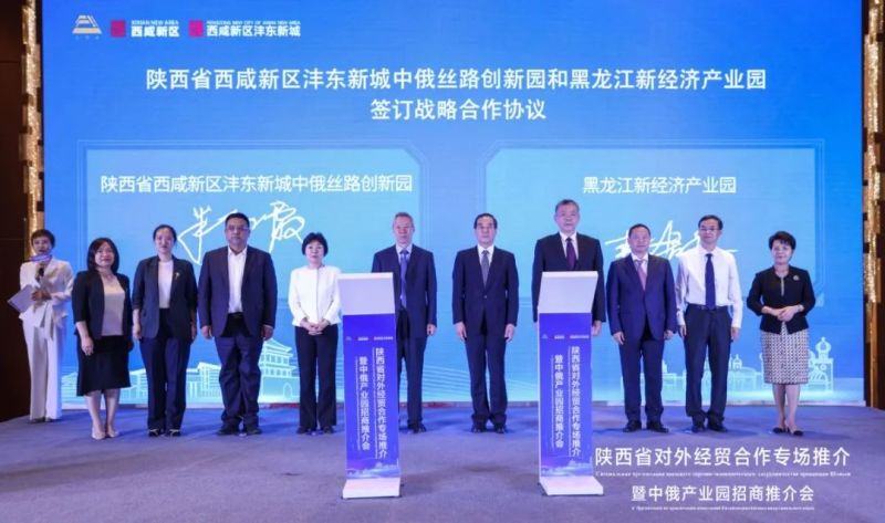 会上,西咸新区沣东新城中俄丝路创新园现场推介并与黑龙江新经济产业园签署战略合作协议,正式开启中俄园区建设跨区域交流合作新征程。沣东新城入区企业西安瑞通能源科技有限公司、俄罗斯NTPTEK公司等6家企业相互签订合作协议,未来将在机械出口、电力设备研发以及电子器件出口开展多领域合作。