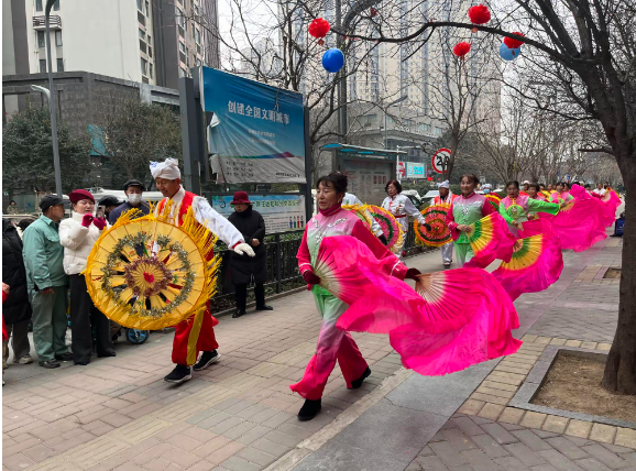 参加演出的大爷大妈们身着鲜艳的表演服装,敲响热情的锣鼓,踏着整齐的律动,舞起灵动的彩扇和漂亮的花伞进行游街演出,演出队伍走过辖区每一处主干道,把新年祝福送给每一位居民。沿途的居民们被热情的秧歌感染,一阵阵喝彩把气氛一次次推向高潮。