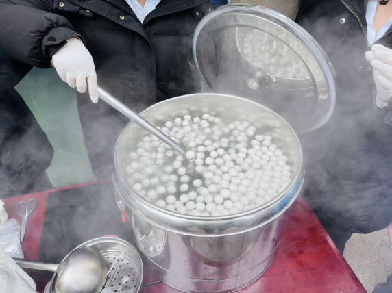 另一侧,煮汤圆现场热气腾腾,各种口味的汤圆被一一放入大锅中,随着水温的升高,汤圆在水中翻滚,散发出诱人的香气。