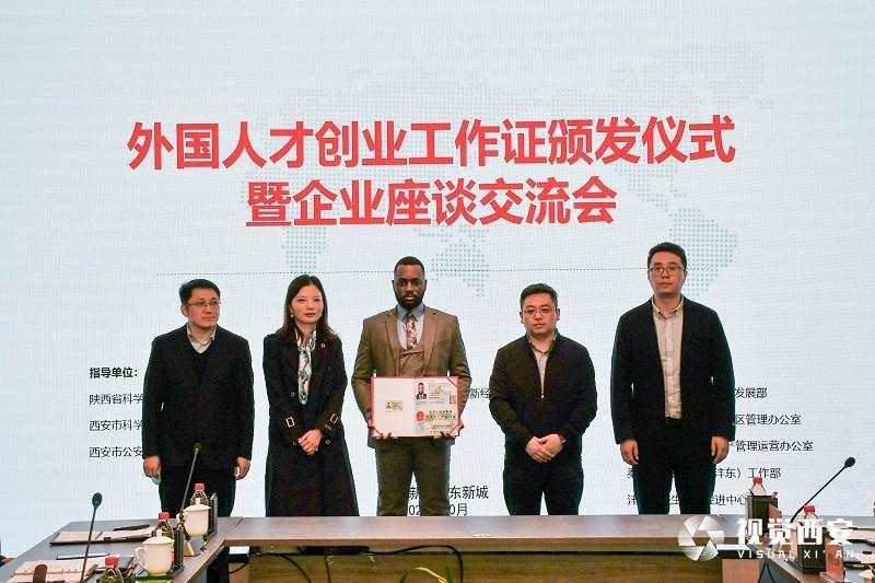 凝聚时代力量,助力创业梦想,为推动国际交流合作与国际人才引进,10月10日,外国人才创业工作证颁发仪式暨企业座谈交流活动在西咸新区沣东新城自贸新天地园区举行。来自刚果(布)的外籍留学生创业者ROLF GERSON OWONDA DENGUET(中文名:英勇)在西咸新区沣东新城帮助下,获得由陕西省科技厅与西安市科技局共同颁发的陕西省首个外国人才创业工作证。