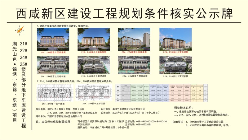 根据西安市自然资源和规划局《关于加强建设工程规划条件核实管理工作的通知》,现将湖光山色·锦绣(东锦、东绣)项目21#、22#、24#、25#楼及部分地下车库建设工程规划条件核实情况予以公示。批前公示并非最终审批结果,在公示期内,利害关系人若有意见,可来电向西咸新区自然资源和规划局(沣东)工作部、沣东新城开发建设部反映。
