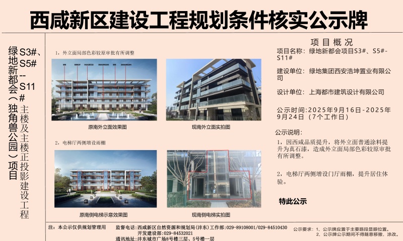 根据西安市自然资源和规划局《关于加强建设工程规划条件核实管理工作的通知》,现将绿地新都会项目S3#、S5#-S11#主楼及其正投影建设工程规划条件核实情况予以公示。批前公示并非最终审批结果,在公示期内,利害关系人若有意见,可来电向西咸新区自然资源和规划局(沣东)工作部、沣东新城开发建设部反映。