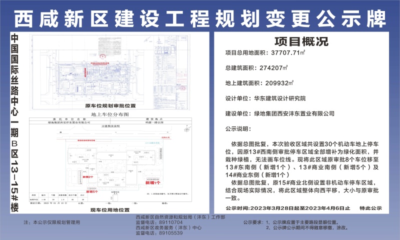 中国国际丝路中心一期B区项目位于陕西省西咸新区沣东新城科源一路以西,王寺东街以北。经审查,该项目变更方案中各项指标满足国有建设用地使用权出让合同及相应规划条件书要求,我中心拟同意按程序进行方案变更,具体变更情况附后。