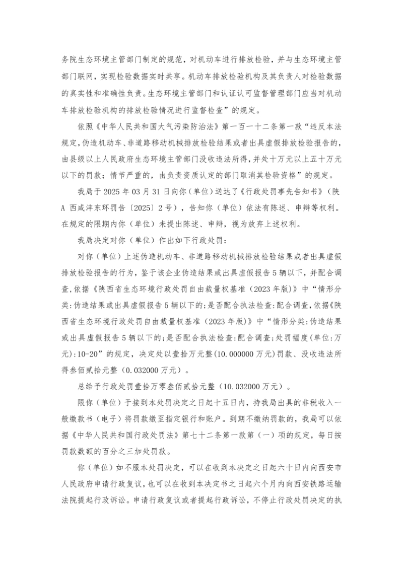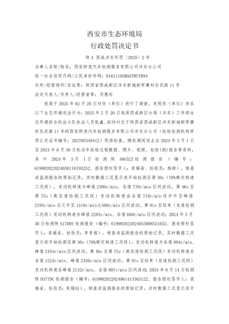 按照《环境信息公开办法(试行)》和生态环境部有关要求,西咸新区生态环境局(沣东)工作部依法公开2025年西安胖虎汽车检测服务有限公司沣东分公司责令改正违法行为决定和行政处罚决定信息。 |
