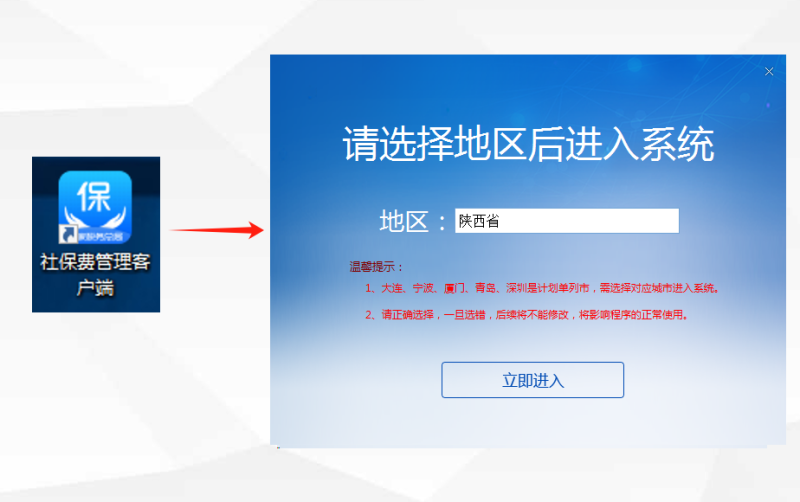 点击进入客户端,根据页面提示选择所在地区(陕西参保一定要选择“陕西”,即可启动客户端。