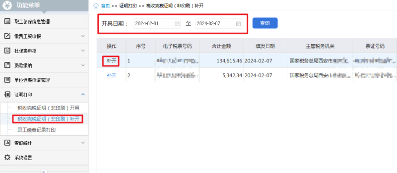 具体操作如下:点击“税收完税证明(非印刷)补开”--选择相应属期--点击“查询”--点击“补开”,即可完成社保费完税证明开具。