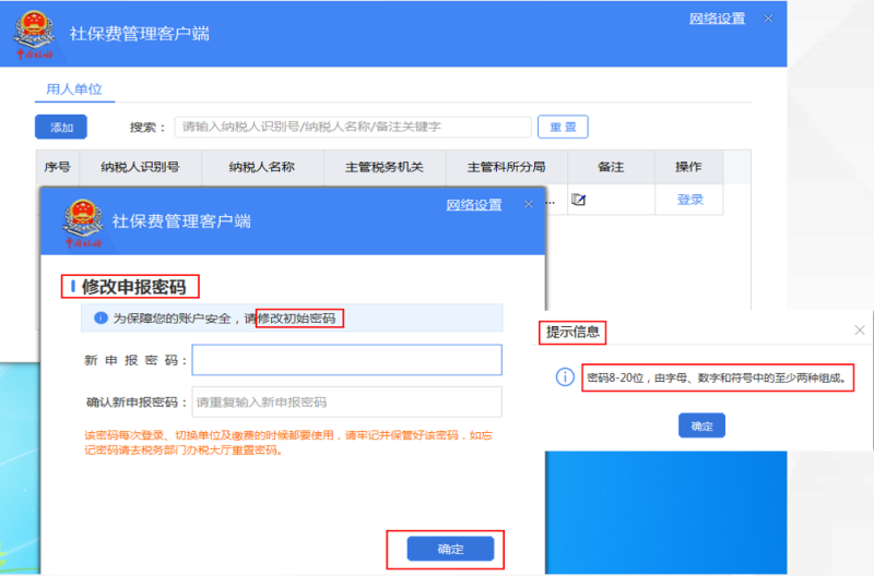 初次使用登录社保费客户端后,需修改初始申报密码,(建议8-20位,由字母、数字和符号中的至少两种组成),修改后使用新密码登录。如果忘记申报密码时,需要去办税服务大厅重置密码或联系电子税务局征纳互动转人工重置密码。