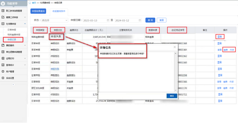 登录“社保费管理客户端”,点击【社保费申报】-【申报记录】,进入该模块后,可点击“申报记录”中的【查看】功能,系统会弹窗展示申报明细。