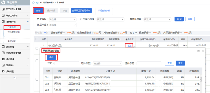 2.点击待申报数据中的“缴费人数”数字可查看职工缴费明细信息。