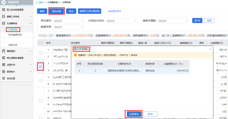 1.点击【社保费申报】-【日常申报】,进入此模块后,系统会自动带出用人单位全部的待申报数据。