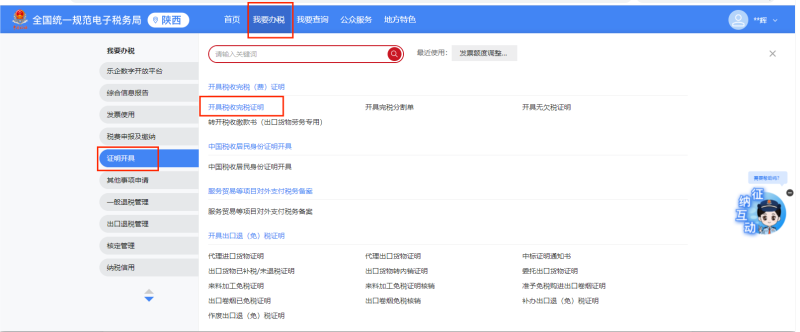 1.登陆“陕西省电子税务局”,点击【我要办税】-【证明开具】-【开具税收完税证明】;