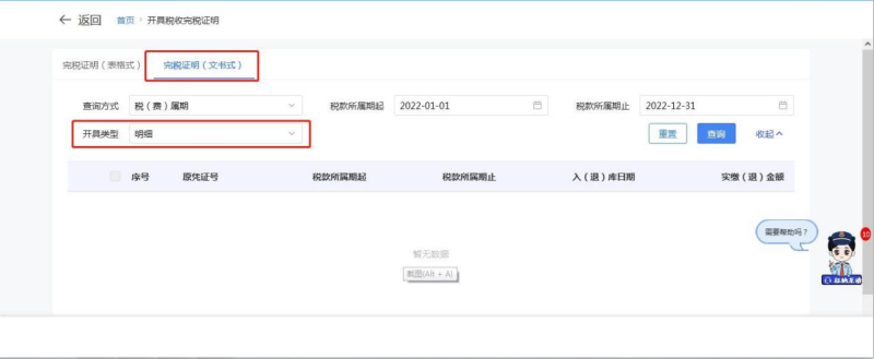 2.进入【开具税收完税证明】模块,选择【完税证明(文书式】-查询方式选择为“税(费)属期或缴(退)款时间”,选择查询日期,开具类型选择“明细或汇总”;