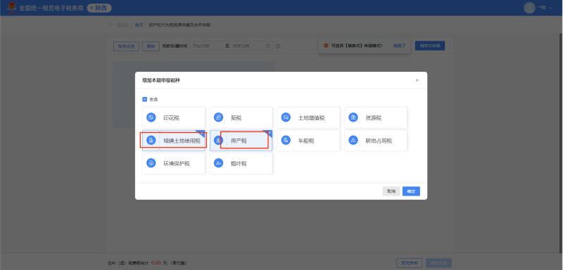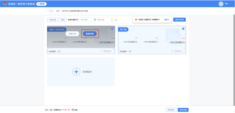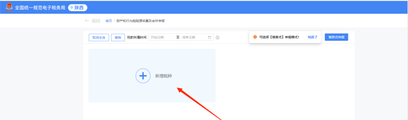 2.进入申报界面后点击【新增税种】--选择【城镇土地使用税/房产税】;
