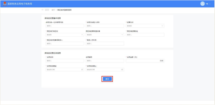 2.进入【跨区域涉税事项报告】--【新增报告】,在新增报告页面,填写跨区域经营基本信息和跨区域经营合同等信息。其中“跨区域涉税事项联系人”用于经营地涉税业务办理,请务必准确填写姓名和手机号,否则将导致该人员无法登录电子税务局办理业务。