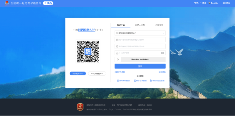 1.打开“陕西省电子税务局”,在“特定主体”身份下选择“跨区域涉税事项报验户”进行登陆;