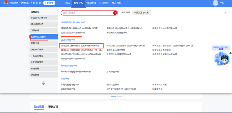 1.登陆“陕西省电子税务局”,点击【我要办税】--【税费申报及缴纳】--【居民企业(查账征收)企业所得税年度申报】。