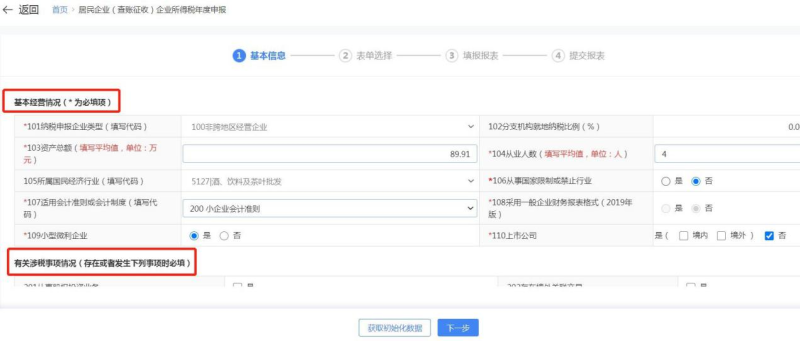 2.填写基本信息:纳税人进入基本信息填写时,系统会根据企业登记、财务会计制度备案等信息自动预填基本经营情况、有关涉税事项情况、主要股东及分红情况,纳税人需确认预填信息并根据实际情况进行修改。