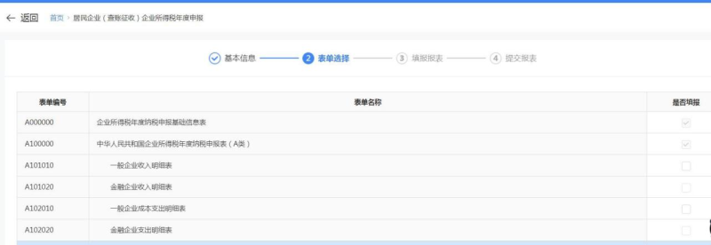 3.选择表单:系统会根据企业基本信息、月(季)度申报情况,默认勾选匹配的表单。如果纳税人属于小型微利企业,根据填报数据,系统可免于填报部分表单(如下图),纳税人也可根据实际情况新增表单,确认后进入申报表填写。