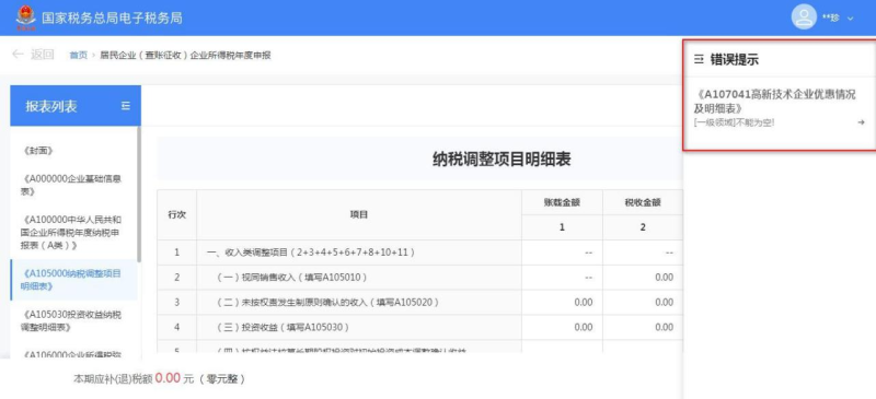 5.提交申报:纳税人确认数据无误,点击【提交申报】,若在右侧弹出错误提示(如下图),纳税人必须根据提示内容对报表进行修改后才能提交申报。