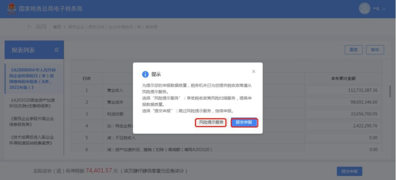 (1)提交申报时系统提示是否需要进行风险扫描,纳税人可点击【风险提示服务】进行风险扫描,提高申报数据质量,也可直接点击【提交申报】。