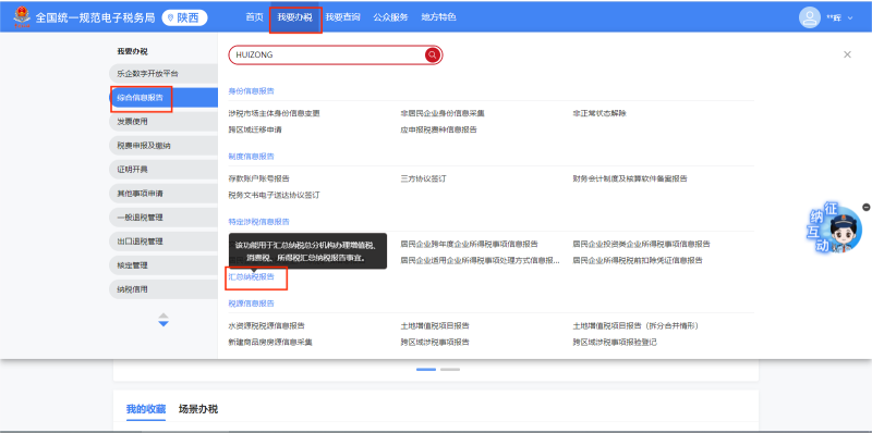 1.登陆“陕西省电子税务局”,点击【我要办税】--【综合信息报告】--【汇总纳税报告】。