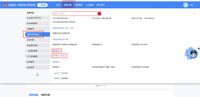 1.登陆“陕西省电子税务局”,点击【我要办税】--【税费申报及缴纳】--【申报更正与作废】。