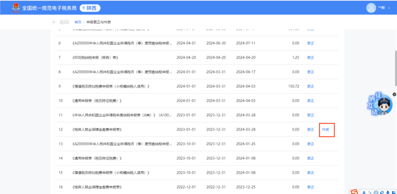 进入【申报更正与作废】,根据申报日期、税款所属期,或者【展开】里的申报表名称查询到需要作废的申报表,点击【作废】。