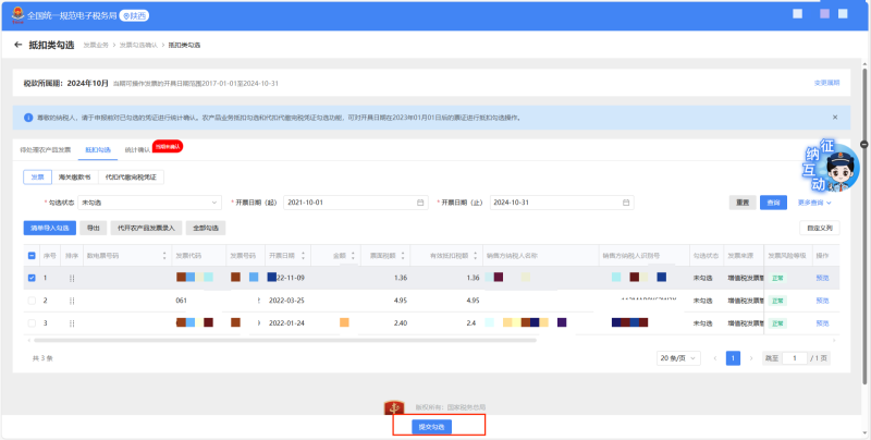 3.选择发票所属期,勾选要认证的发票,点击【提交勾选】。
