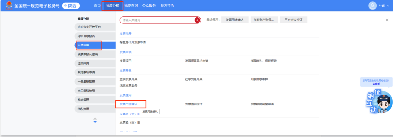 1.登录“陕西省电子税务局”,点击【我要办税】--【发票使用】--【发票用途确认】。