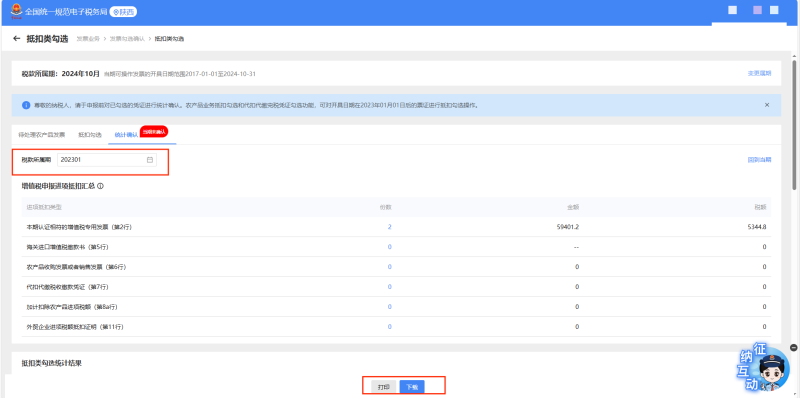 4.选择【税款所属期】,点击【下载】,可以下载往期认证发票数据。