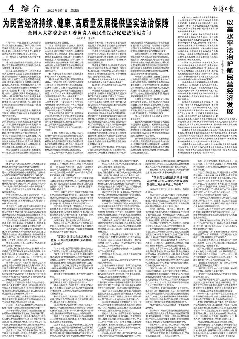 4月30日,十四届全国人大常委会第十五次会议表决通过了《中华人民共和国民营经济促进法》,自2025年5月20日起施行。这是我国第一部专门关于民营经济发展的基础性法律,事关“两个毫不动摇”的坚持和落实,事关经济高质量发展。
