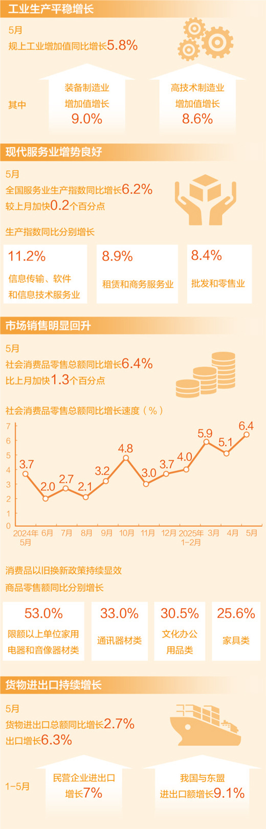持续改善。宏观政策持续显效,国内需求扩大,生产供给增加,部分指标继续改善。5月份,社会消费品零售总额同比增长6.4%,比上月加快1.3个百分点。1至5月份,服务零售额增长5.2%,比1至4月份加快0.1个百分点。消费增长加快,尤其是服务消费扩大,拉动相关服务业增长。5月份,批发和零售业、住宿和餐饮业生产指数分别比上月加快1.6和0.9个百分点。